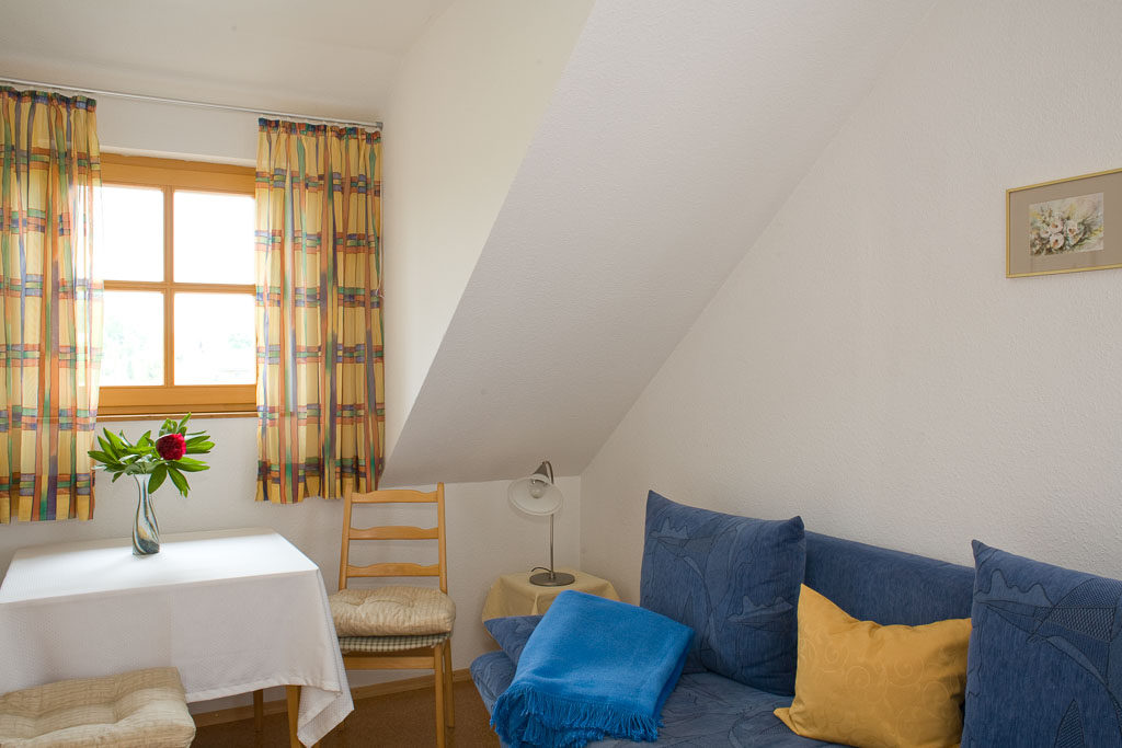 Unsere zweite Ferienwohnung hat eine ähnliche Raumaufteilung, jedoch keinen Balkon. Sie ist mit einem Bad, einer voll ausgestatteten Küche und einem Schlafsofa sehr gut für zwei Personen und ein Kind ausgelegt. Unser Garten mit einer Liegewiese und einer überdachten Sitzmöglichkeit steht ebenfalls für Ihre Erholung zur Verfügung.